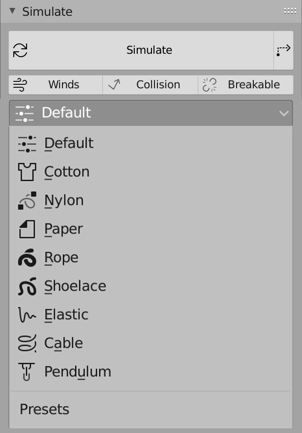In this section you can activate the simulation. The button on the right of the play one allows to resume the simulation using the current frame. This allows you to continue the simulation indefinitely when you press it successively (as long as the simulation does not reach 100%). Notice that it’s available only when the ends are not animated. You can simulate with a lot of preset to make the simulation more realistic.